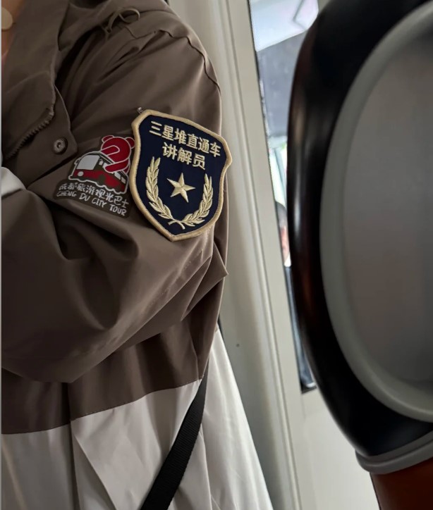 春熙路那个趴着的大熊猫下有公交公司的景区直通车,路程1小时10分钟左右,我们走过去的时候迎面好几个佩戴胸牌蓝色工作服的男子招揽我们买票上车,有了经验的我们没理,直到看到图一那个穿着成都公交制服的女孩才敢买票上车,一个人25元,大家注意别上错车,我们这班是12:40发车,开车后她开始讲解,告知我们博物馆等游览路线,三星堆的故事以及文物的小故事等,我觉得成都文旅的做法真的太贴心啦,点个赞!后续也是推销了川剧院的变脸和带二维码的冰箱贴,可以看花花的即时动态,好多人买了。