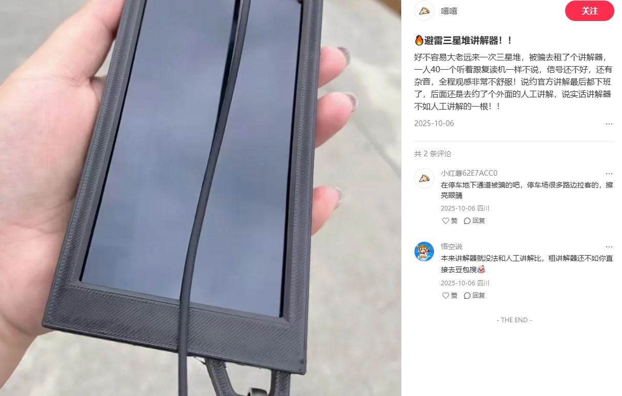 某书上有大量这种对于博物馆拉客的导览器吐槽帖子,其实和官方的30元是没有任何区别的,不过这些人因为对还没进馆的朋友采取了认知差,告诉你博物馆内的讲解不怎么好,实际讲解内容都是差不多的,唯一区别就是贵!