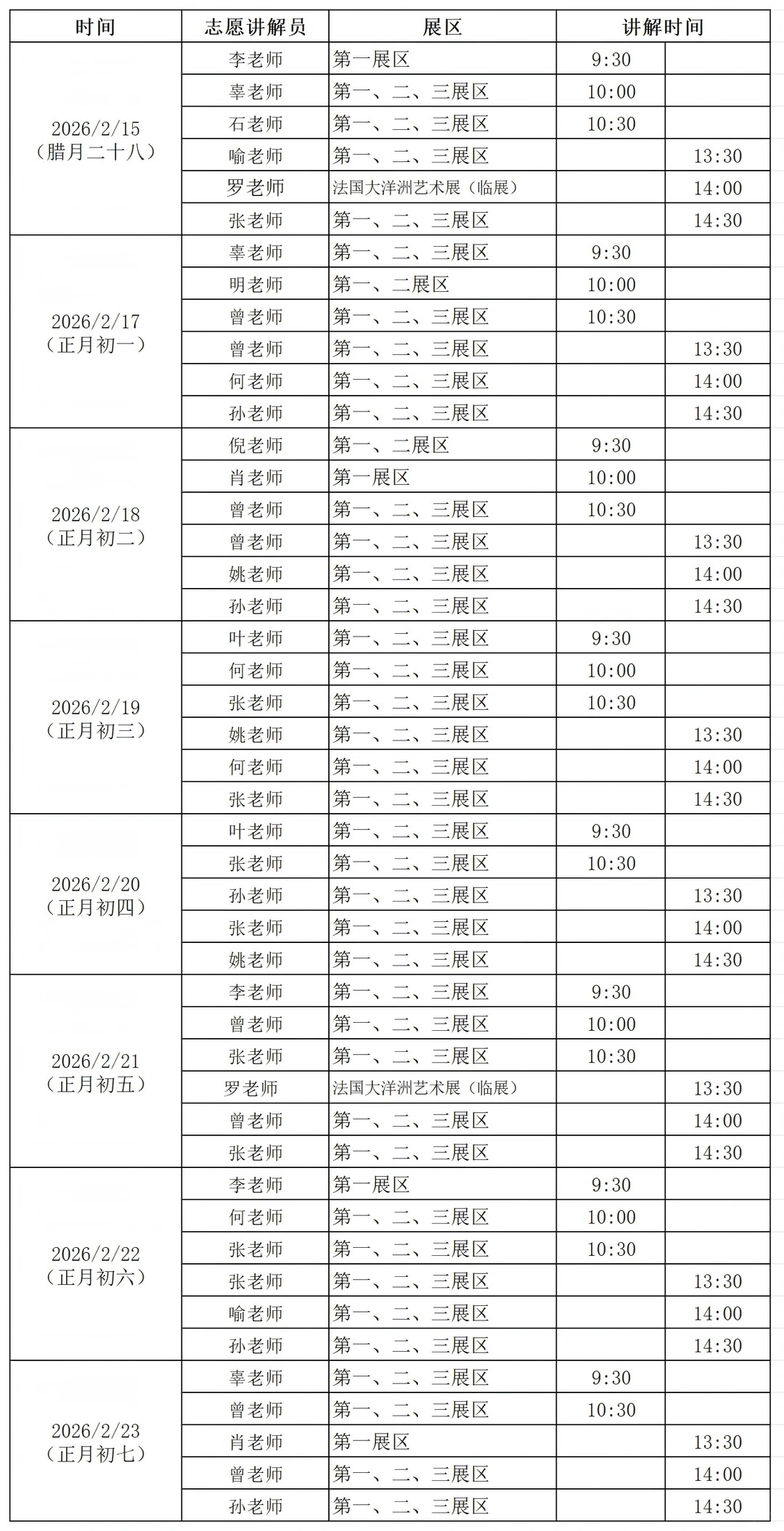 2026春节志愿讲解排班表: